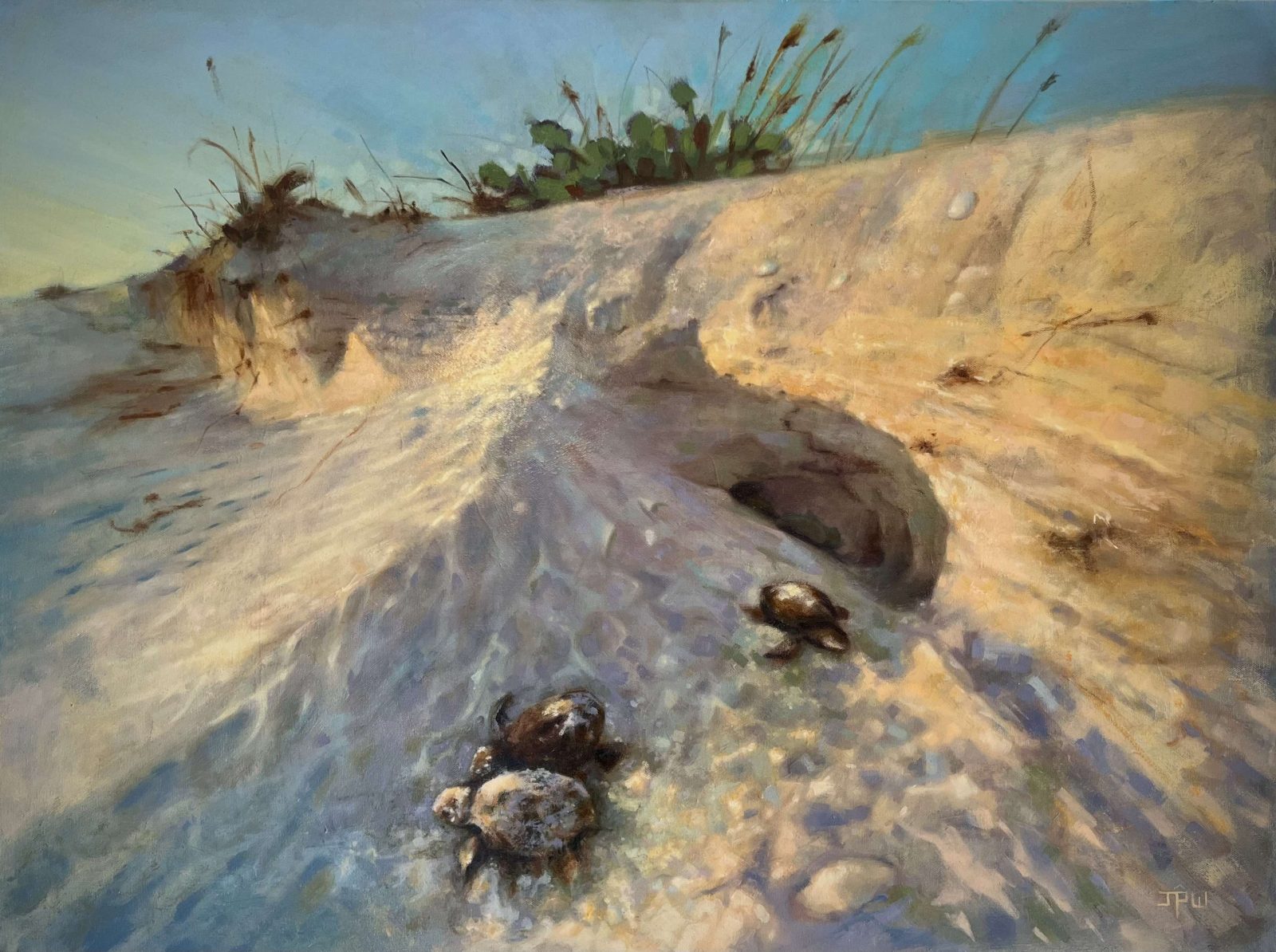 40 in x 30 in oil painting of baby sea turtles hatching.