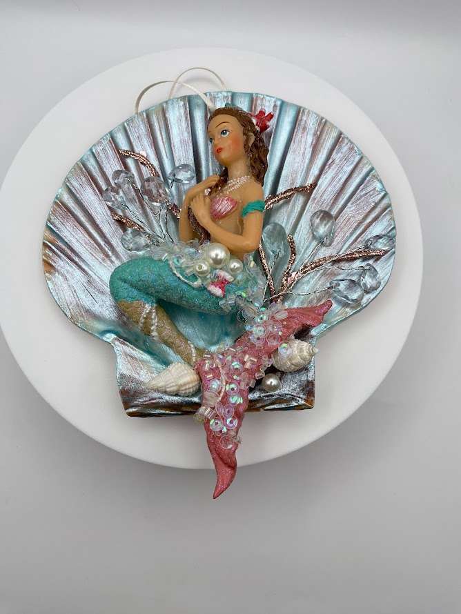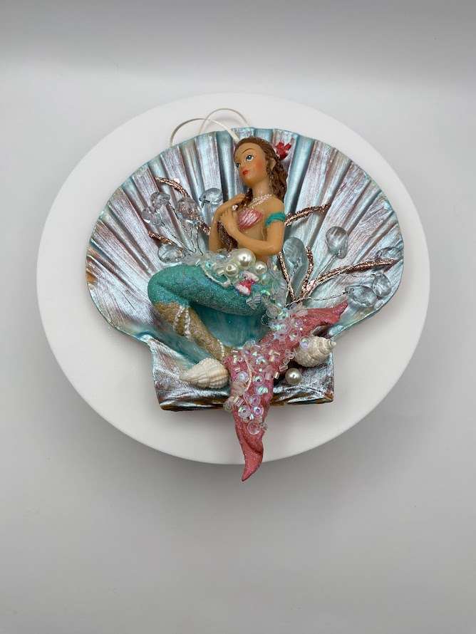 Beautiful mermaid scallop shell ornament. Hang as an ornament, or on your rear view mirror. Reminder of beautiful Siesta Key beach! Fun Coastal Art! Made by Maureen Fox!