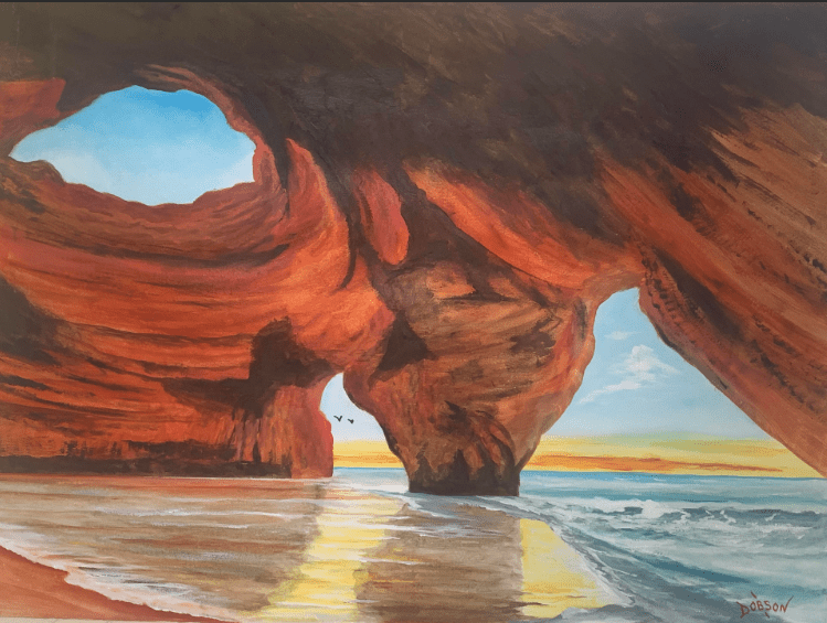 This oil painting is titled: “Benagil Caves Portugal. The size is 30″h x 40″w and was inspired from one of my vacations to the area. It is created on stretch canvas and ready to hang. I ship FREE to the USA.