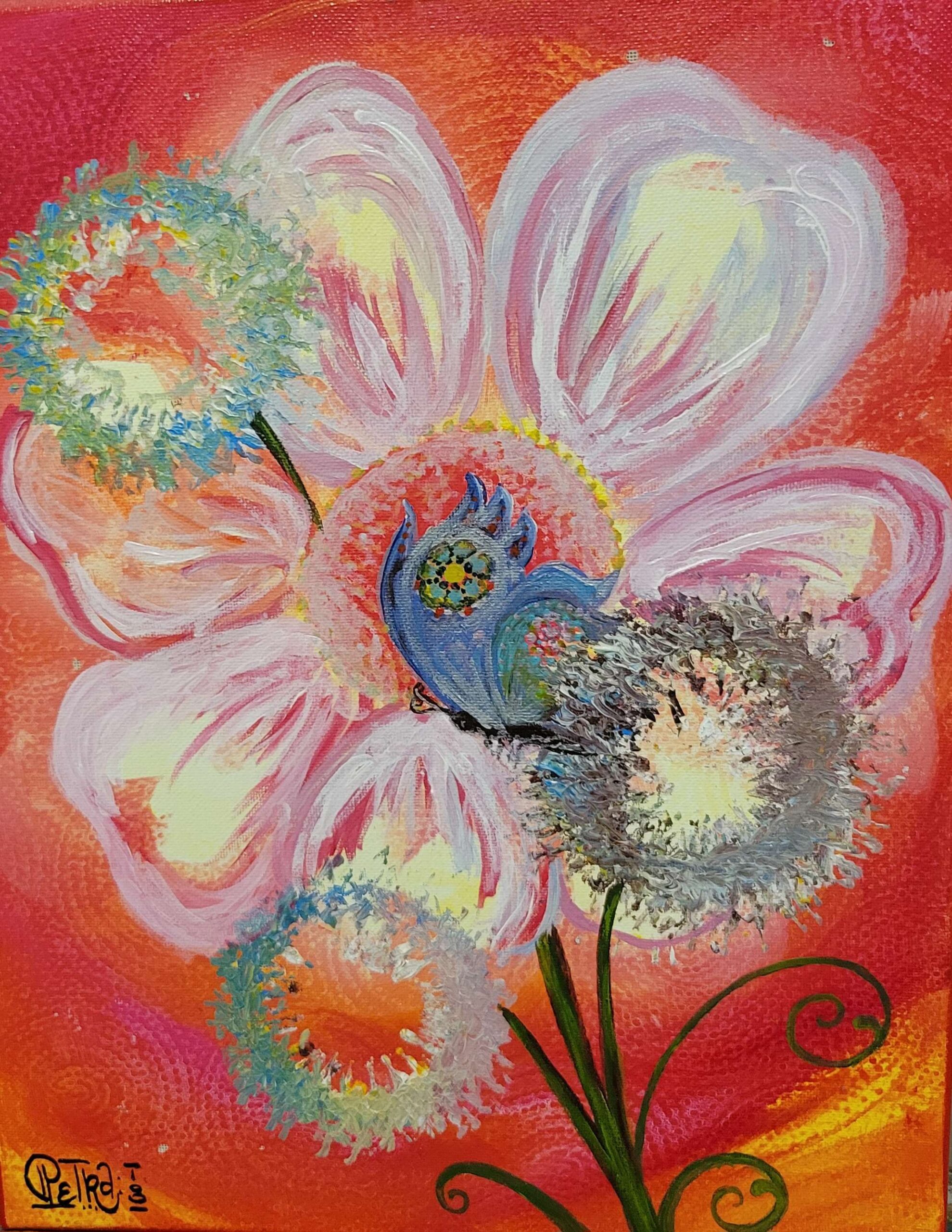 “Blooming Harmony” captures the sense of balance and beauty in the composition. The painting depicts a vibrant floral arrangement, featuring a large, pink flower surrounded by smaller, fluffy blossoms. A delicate blue butterfly rests on one of the smaller blossoms, adding a touch of whimsy. The style is expressive and abstract, with loose brushstrokes and a focus on color and texture. The painting conveys a sense of joy and vitality. The color palette is bright and cheerful, with shades of pink, orange, yellow, blue, and green. The contrasting colors create a visually stimulating composition. The painting evokes a feeling of happiness, optimism, and natural beauty. The intricate patterns within the flowers and the delicate details of the butterfly add depth and interest. The vibrant background provides a dynamic and energetic backdrop.