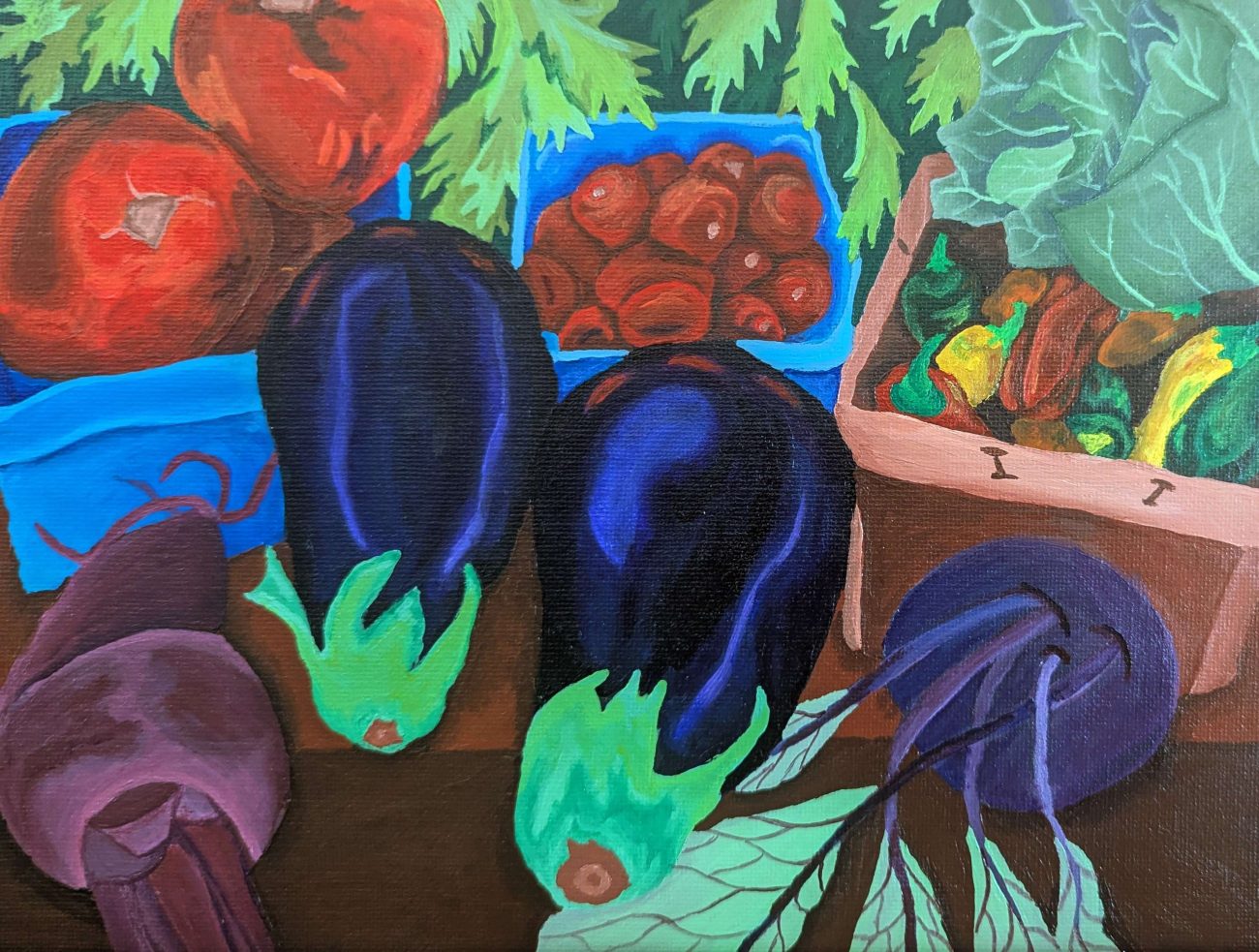 “Bountiful Harvest” bursts with the rich colors and textures of freshly gathered vegetables — plump eggplants, juicy tomatoes, earthy beets, crisp greens, and vibrant peppers. The composition celebrates the joy of fresh food, local markets, and the connection between farm and table. This piece makes a perfect statement in kitchens, dining rooms, farm-to-table restaurants, or for any food lover who appreciates the beauty of nature’s bounty.
