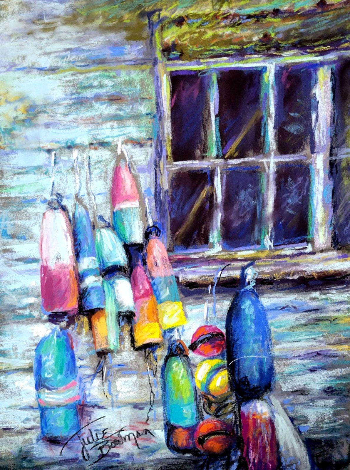 I spotted this buoyed old shed riding my bicycle to the bay.  So festive, I had to paint it!