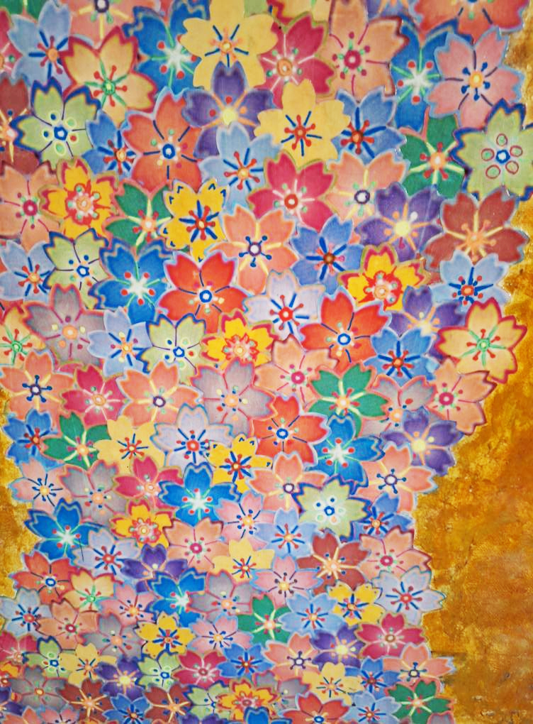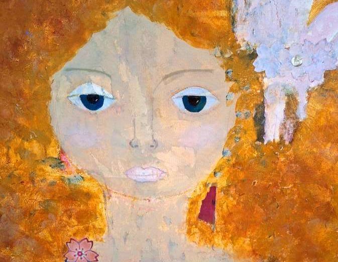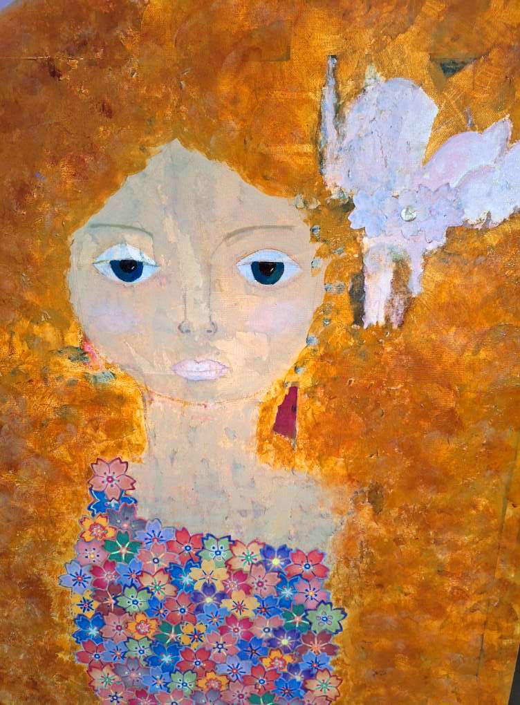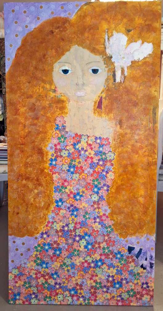 “Cordelia” acrylic painting, collage, folk art 24″ x 48″