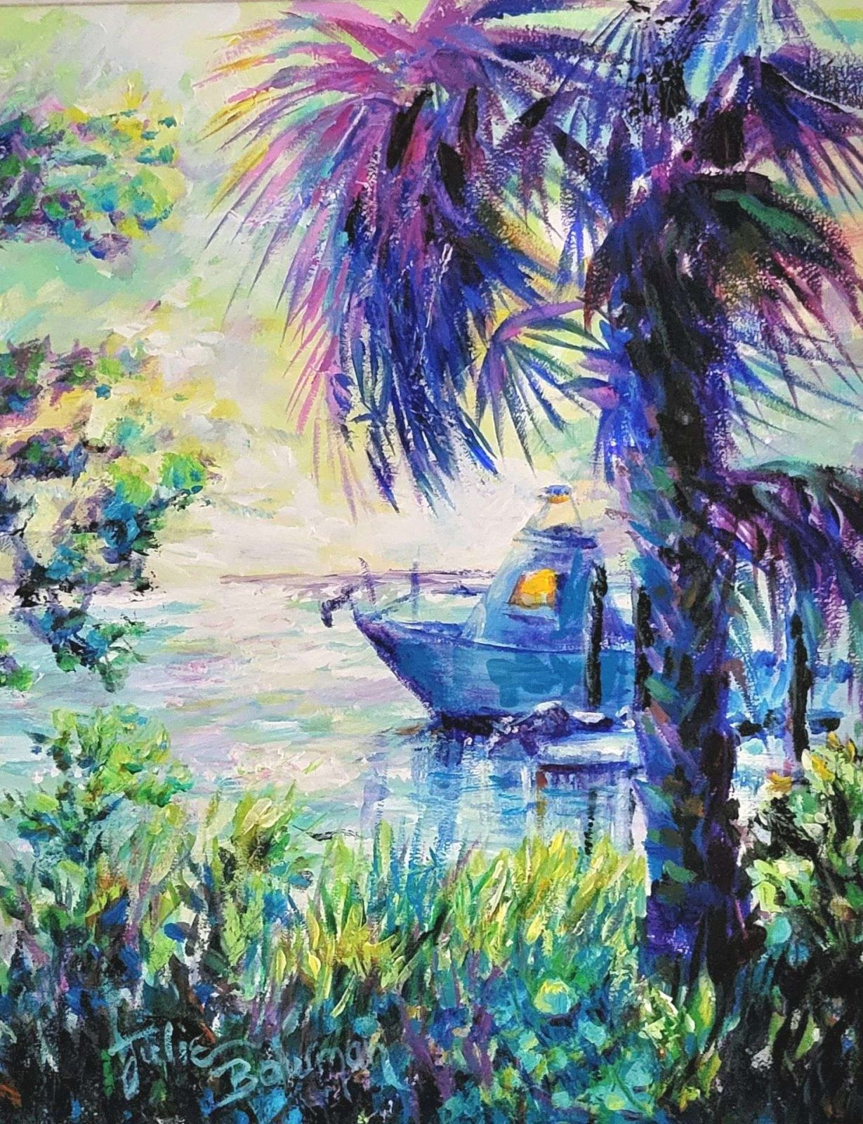 Early morning is a great time to capture unusual light. I love rising before dawn and riding down to the bay and salt marshes. On this morning, the light cast a purple glow to the boat and trees, complimenting the greenery nearby. 16×20 acrylic on canvas, framed in a repurposed frame. Free shipping in continental USA.