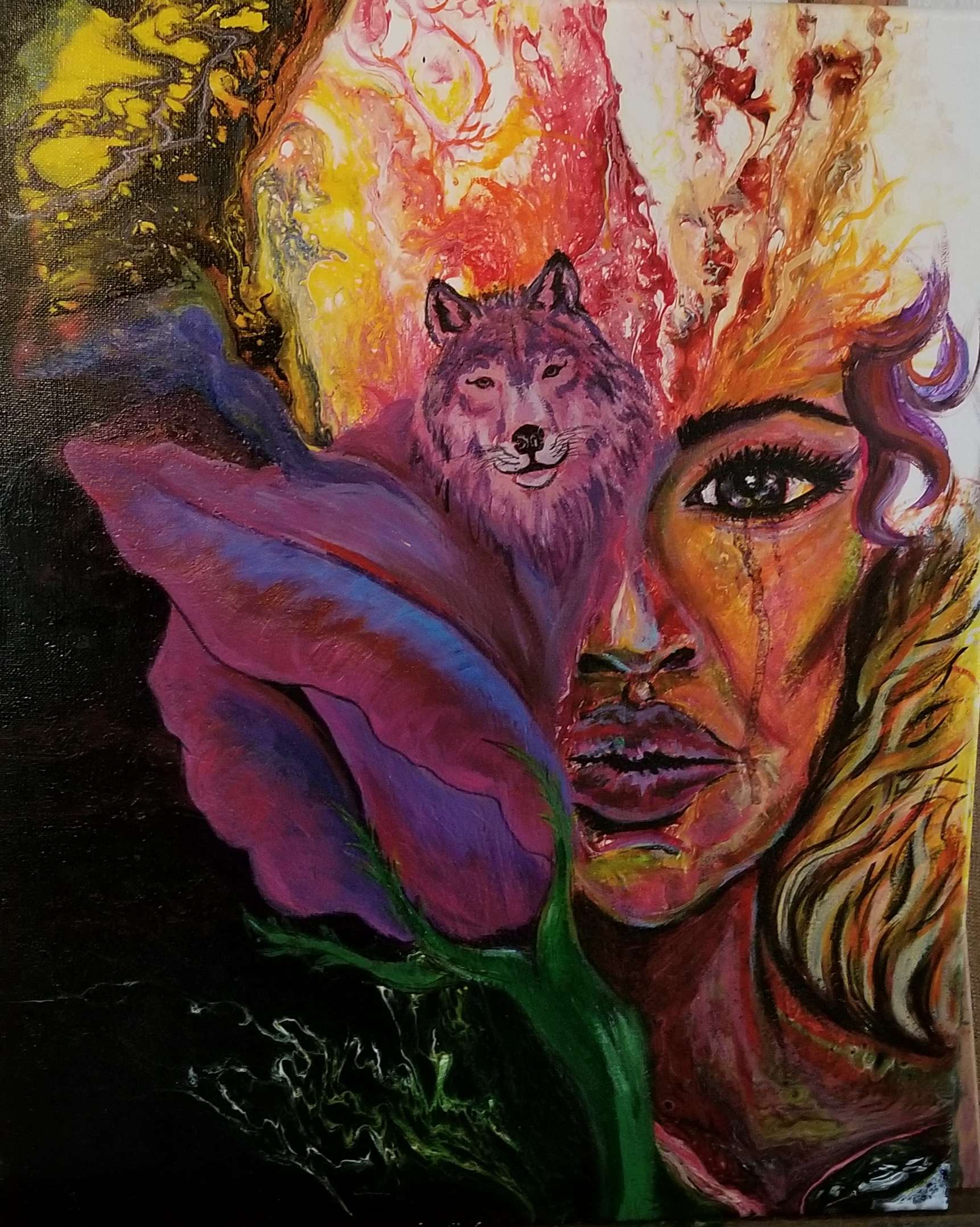 The painting depicts a dramatic and emotional scene where a woman, caught in a blaze, is shown crying amidst the flames. Her anguish is captured with intense brushstrokes and vibrant colors, highlighting the chaos and pain of the fire. To the left side of the canvas, her spirits are reflected and transformed into symbolic figures: a delicate rose, representing beauty and vulnerability; a fierce wolf, symbolizing strength and resilience; and a human spirit, embodying the essence of her soul. The contrast between the raging fire and the serene, reflective spirits offers a powerful exploration of inner turmoil and the complexity of human emotion. Perfect for those looking to enhance their space with a unique and expressive artwork, this piece is a stunning blend of creativity and craftsmanship. Ideal for collectors and lovers of modern art.