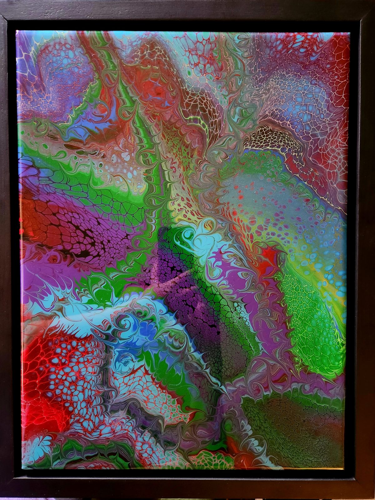 Fluid art acrylic pour on 12×16 inch canvas (this piece is 14×18 inches framed).  A Paul Wilson original painting.