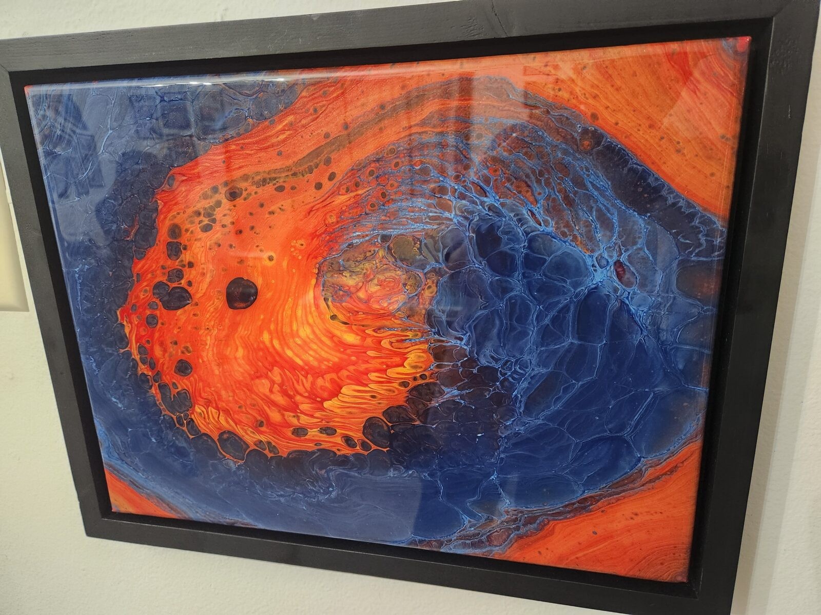 “Fire Wave.” Fluid art acrylic pour on 12×16 inch canvas (this piece is 14×18 inches framed).  A Paul Wilson original painting.