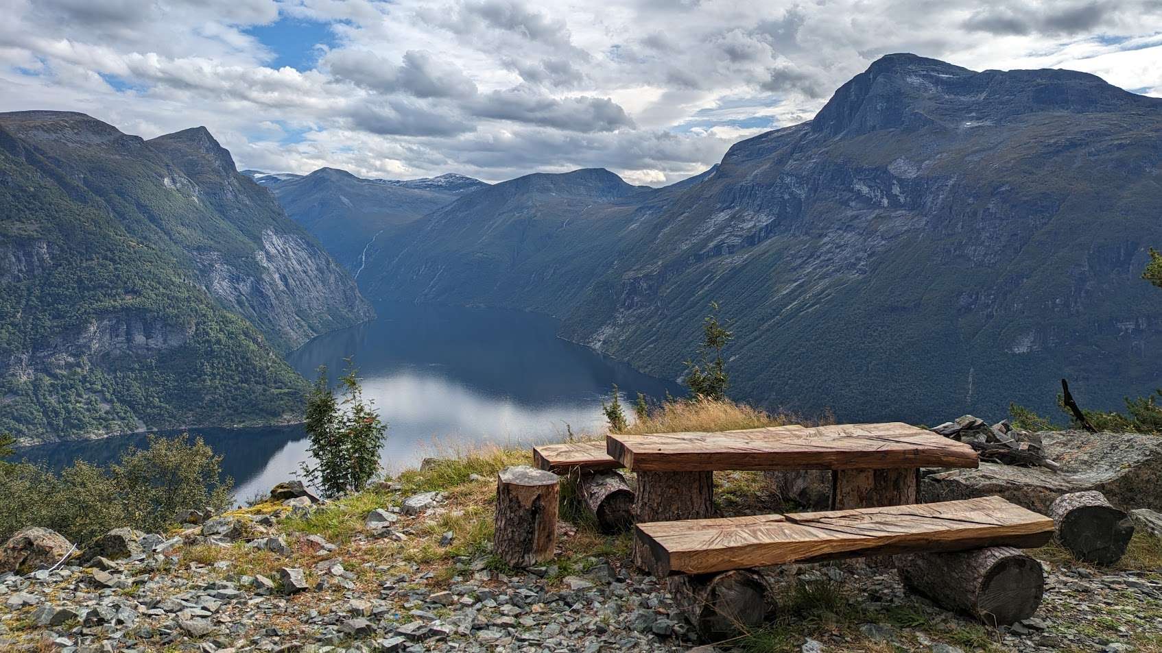 Walking along a seldom used road in the Geirangerfjord in Norway. Labelled as a UNESCO world heritage site because of its exceptional natural beauty. These Fjords were carved by melting glaciers during the last ice age, between 2.5 million and 10,000 years ago. Fancy a Picnic in the Fjords of Norway