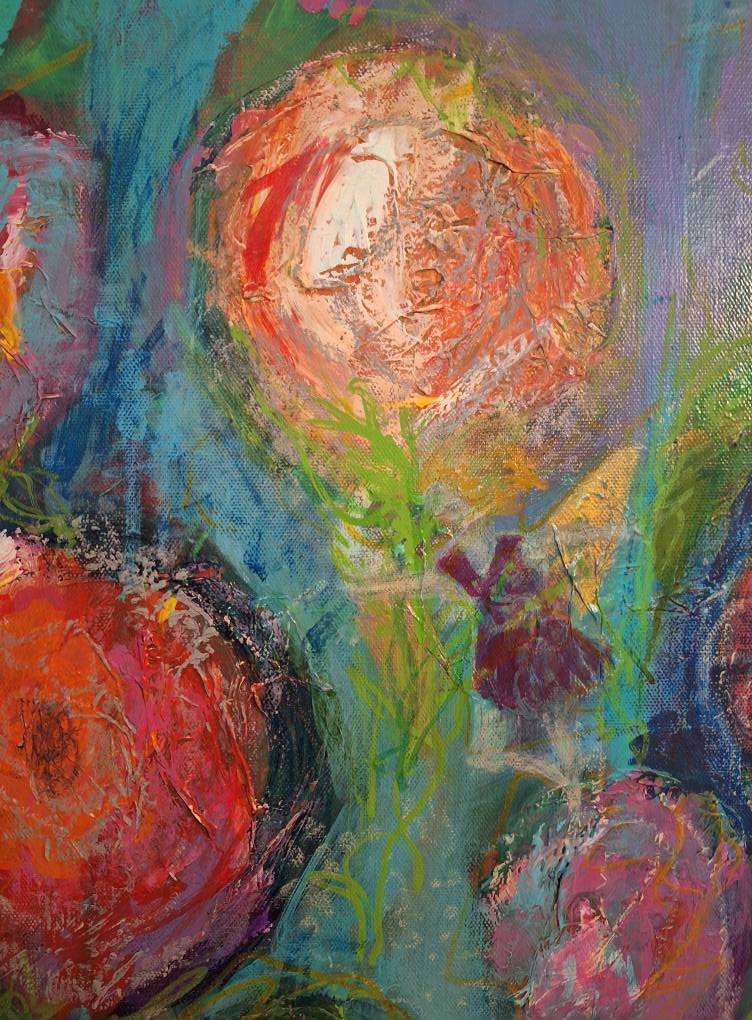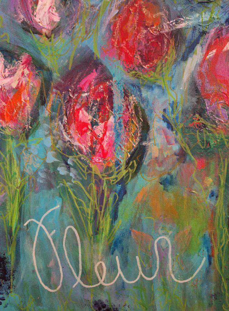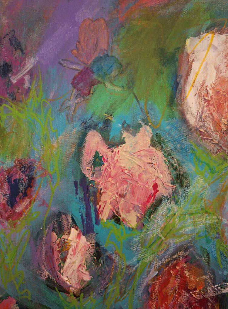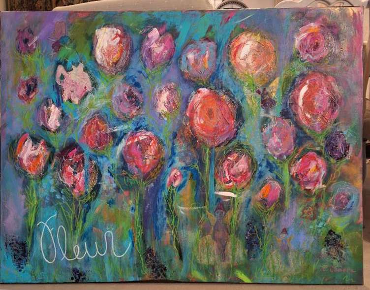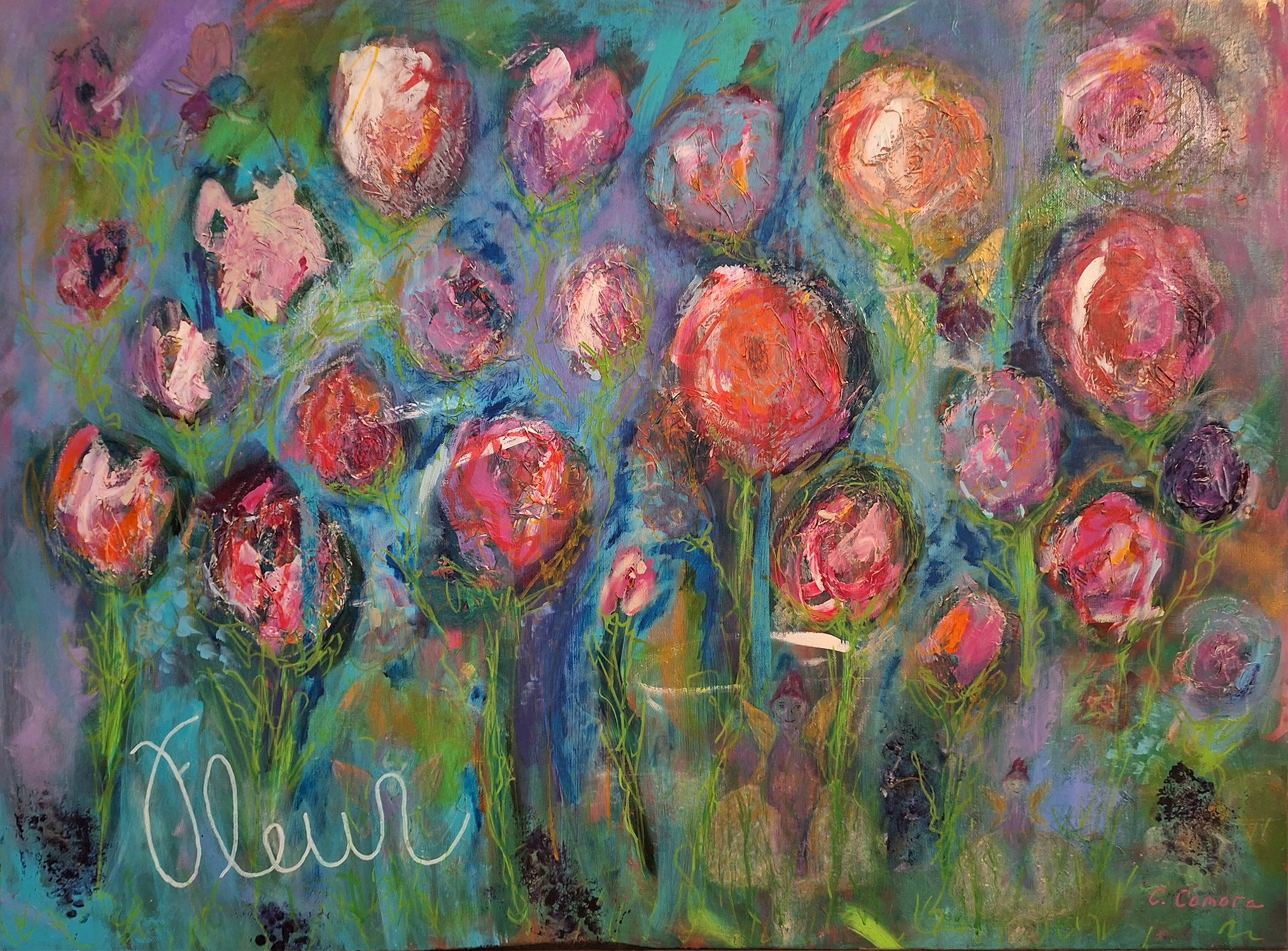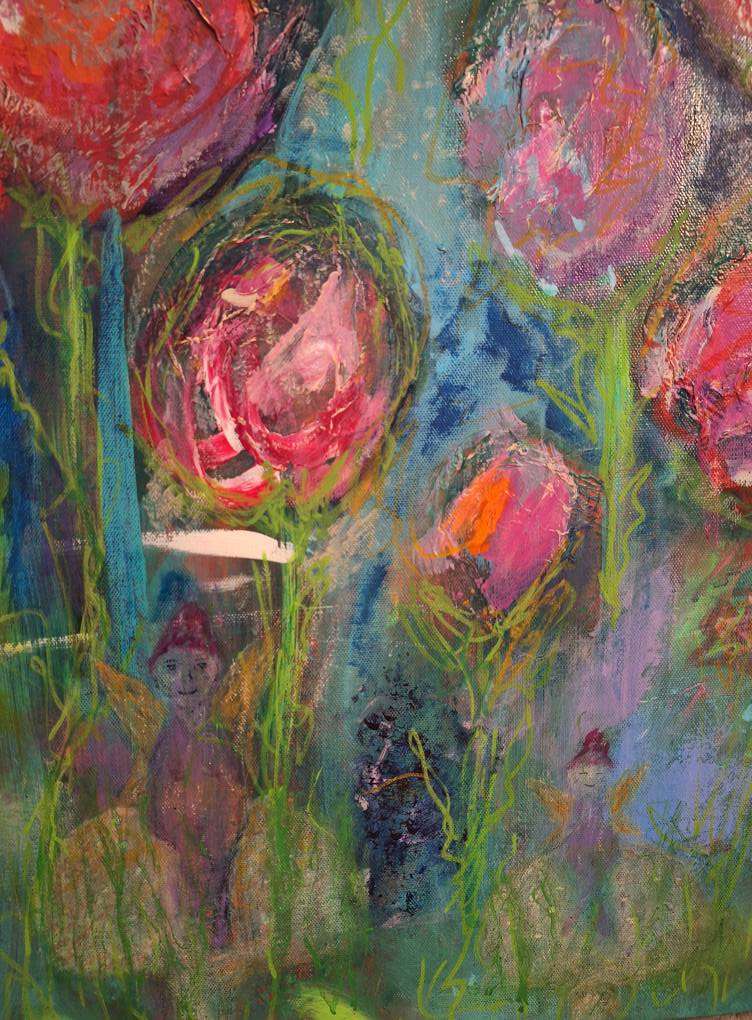 “Fleur: Flowers & Fairies” Acrylic painting of flowers with hidden fairies! Mixed media acrylic painting. 30″ x 40″.