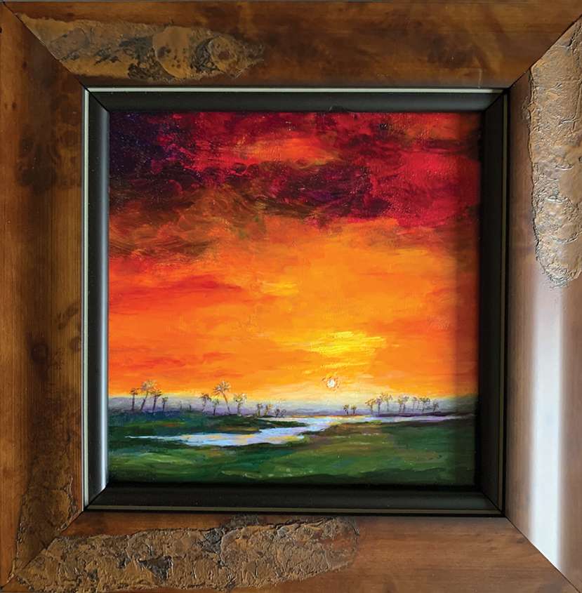 Inspired by the sunset reflecting on water in the Florida landscape. 6×6 inches framed.