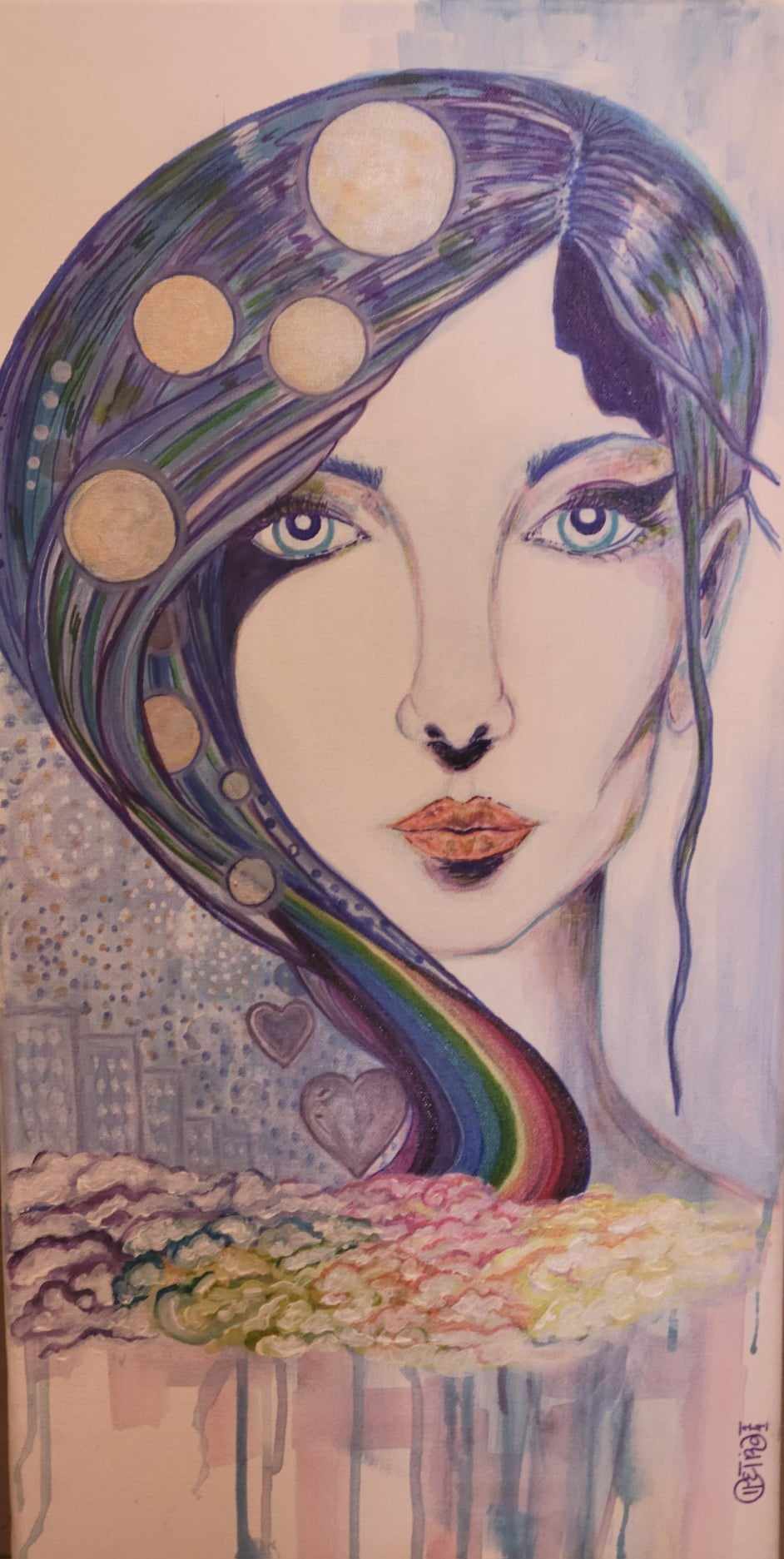 Painting of a grungy woman with a rainbow in her hair, a watercolor metaphysical painting, full color mixed media painting, futuristic woman portrait.