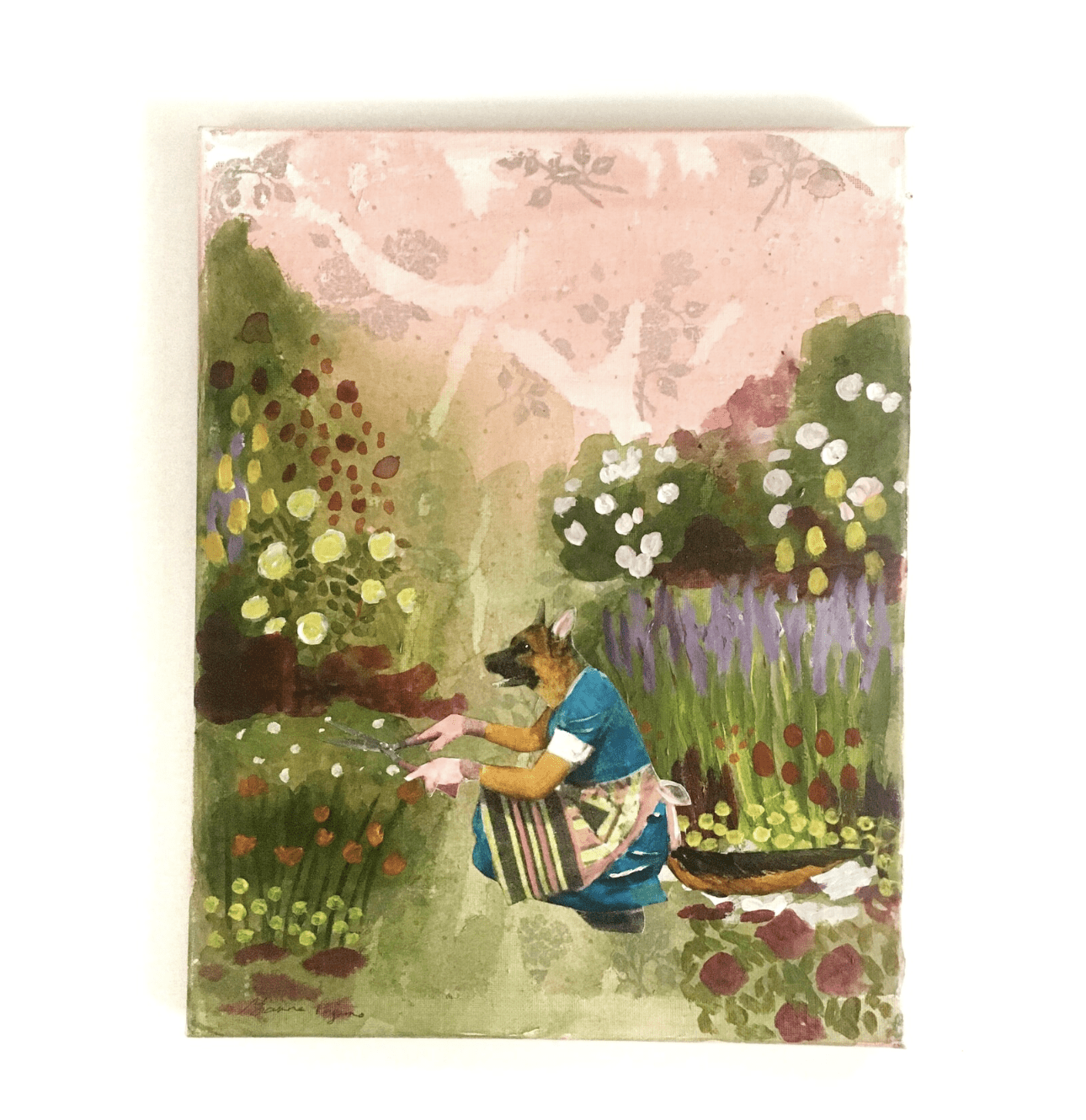 This is an original mixed media piece, created by Gianna Pergamo. It features a sweet German shepherd tending to her garden! The media includes collage and acrylic on canvas. The canvas is 11×14,” half an inch deep, and the canvas edges are painted. This could hang on your wall as-is, unless you prefer to frame it.