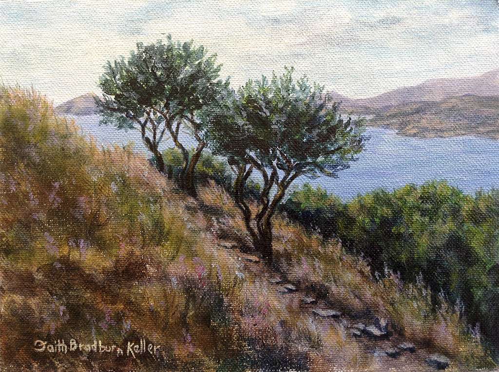 Olive trees holding on to the side of a mountain in Greece ear a temple ruin.