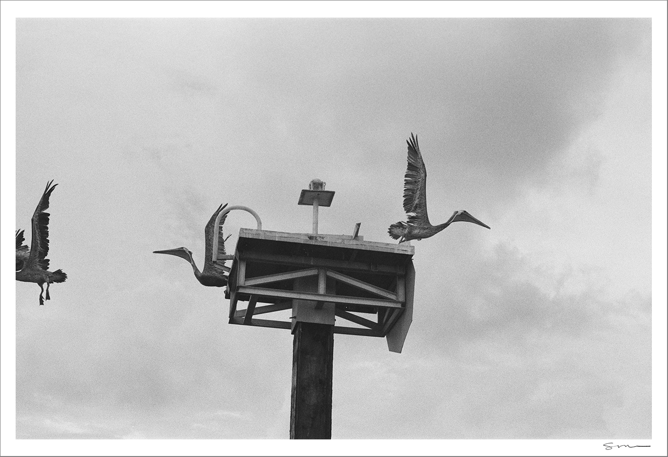 Pelicans fly off of a marker in the Gulf of Mexico just outside Stump Pass in Englewood, Florida. This marker is no longer there as it was destroyed by Hurricane Ian.