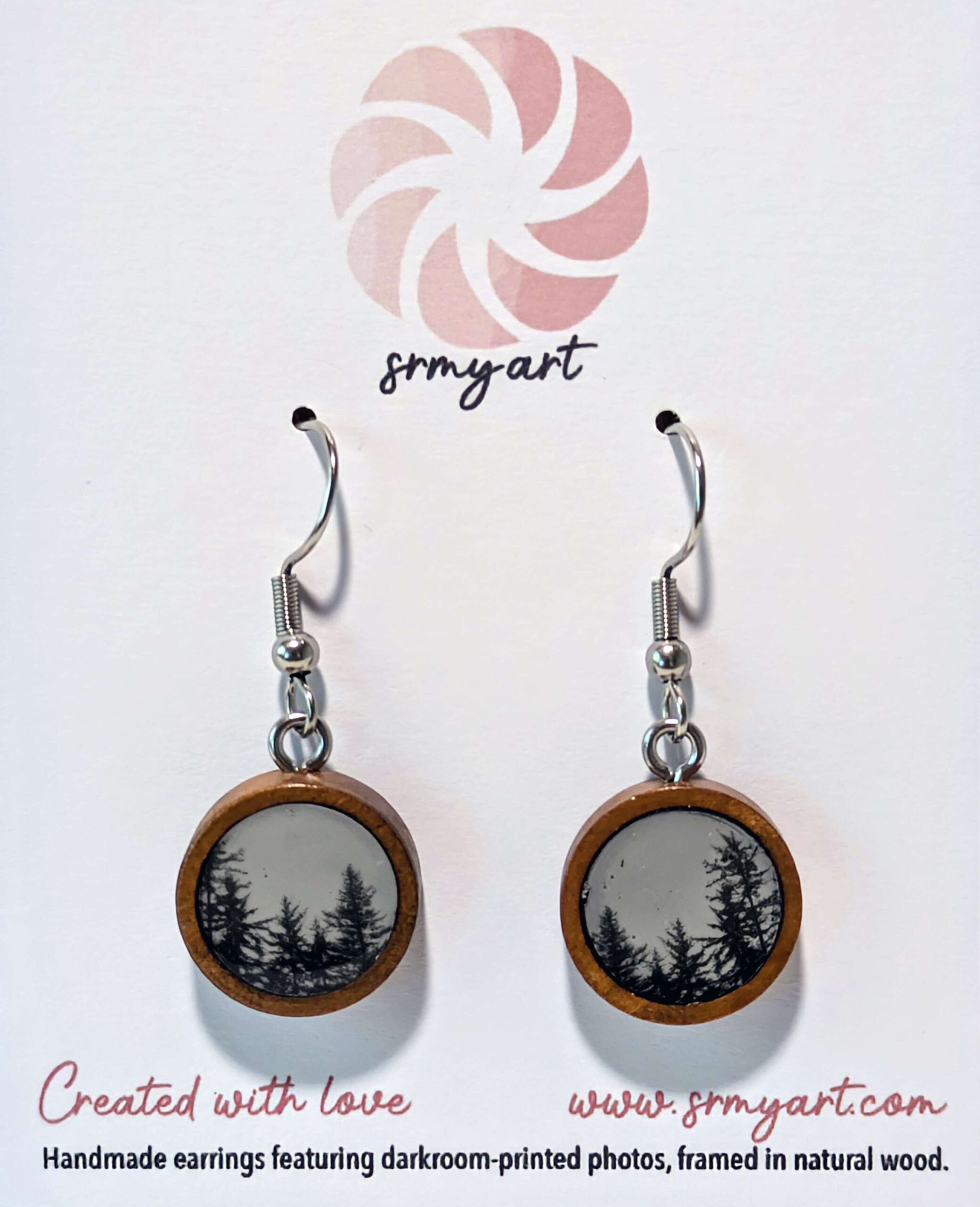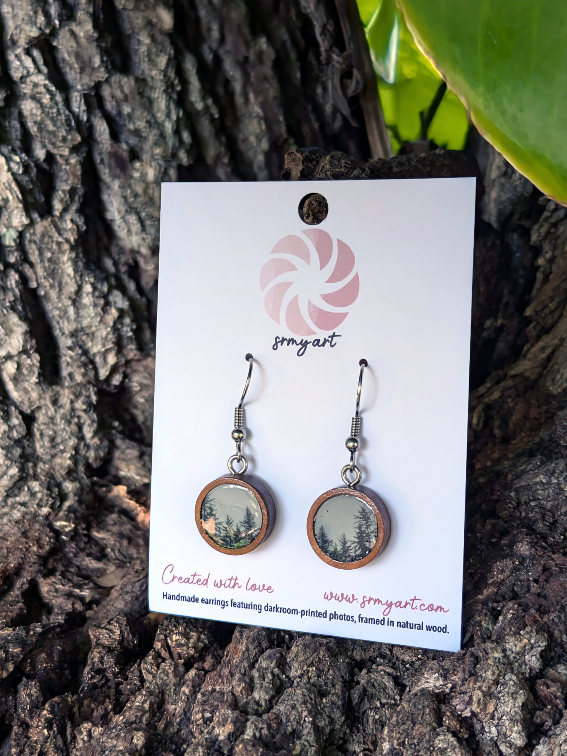 Handmade Wooden Earrings with Darkroom-Printed “Alaskan Rainforest” Photograph