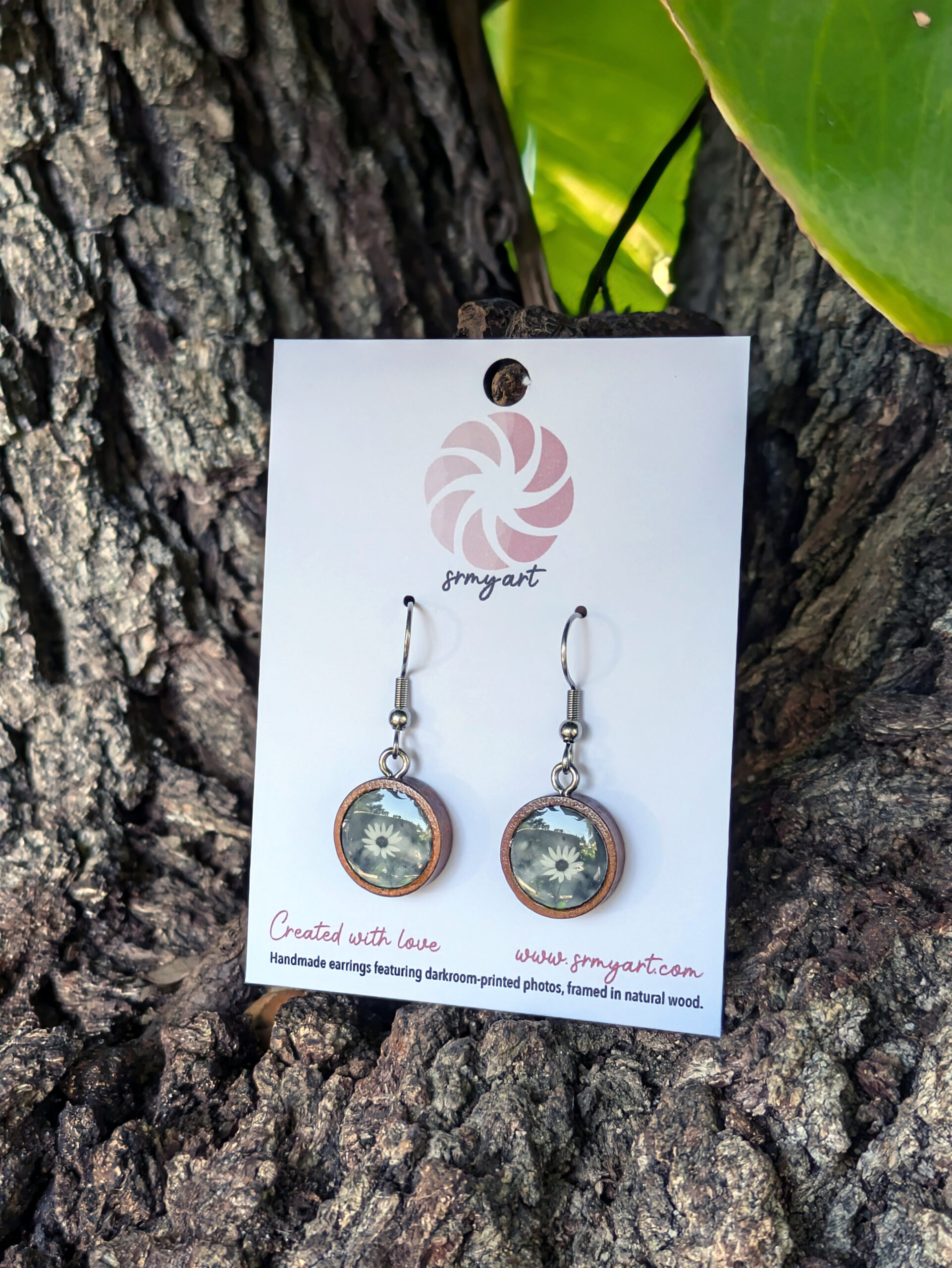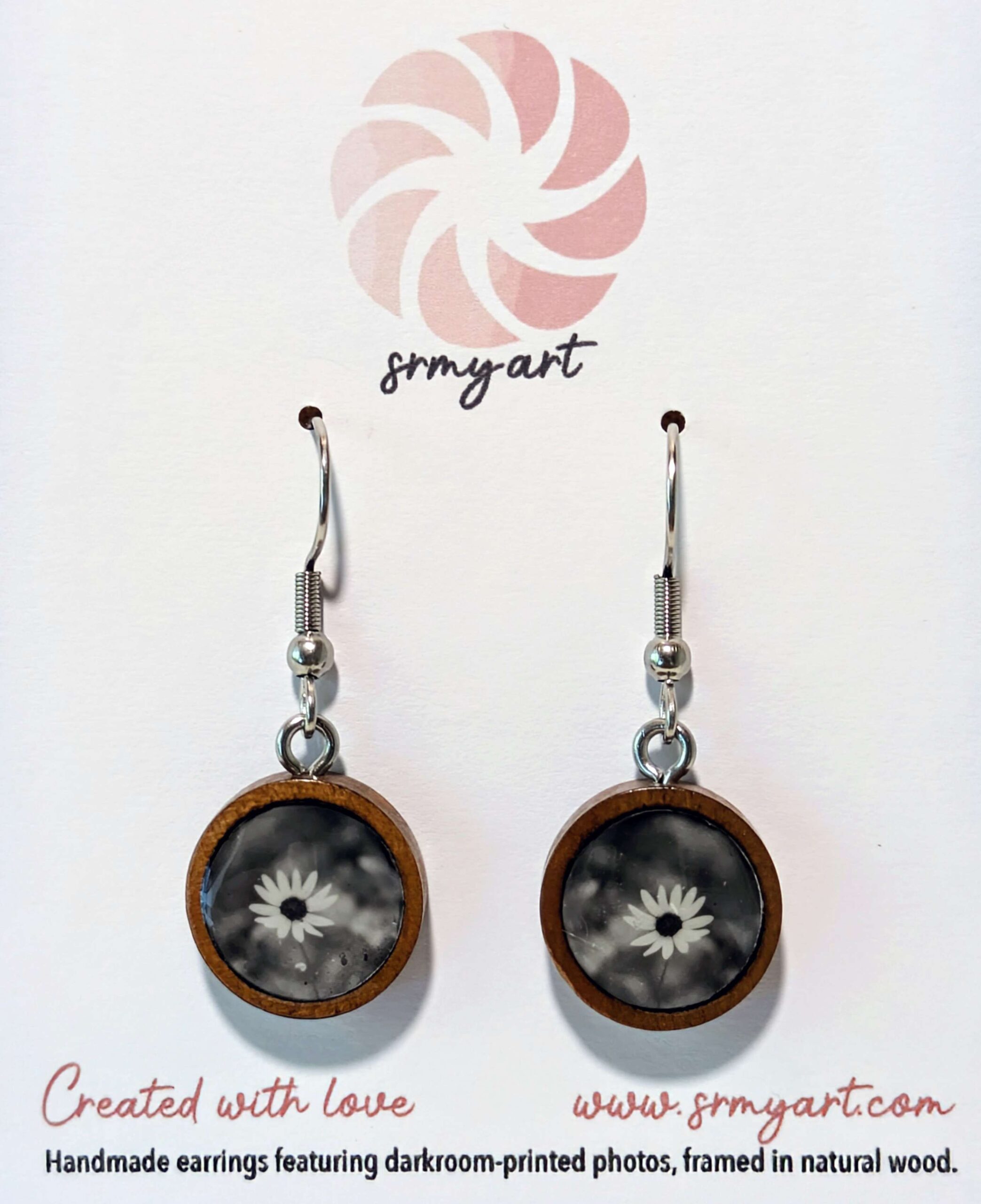 These handcrafted earrings are a perfect blend of art and nature! Featuring the original photograph “Swamp Sunflower”, printed by hand in the darkroom. Each photo is beautifully and intricately set in natural wood for a rustic, organic feel. Whether you’re a nature lover or appreciate unique, artistic jewelry, these earrings are a lovely statement piece for any outfit.