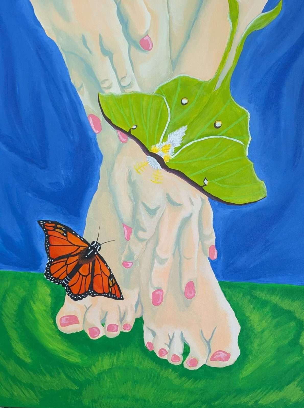 This striking acrylic painting invites the viewer into an intimate moment of connection between the feminine spirit and the natural world. The soft, delicate hands and feet contrast beautifully against the vivid orange Monarch and the ethereal green Luna moth, symbolizing transformation, freedom, and delicate strength. The lush greens and deep blues create a dreamlike setting that feels both grounded and magical. Perfect for nature lovers, collectors of feminine-inspired art, and anyone who values the beauty of transformation and vulnerability. This piece will bring warmth, color, and a touch of poetic symbolism to any space.