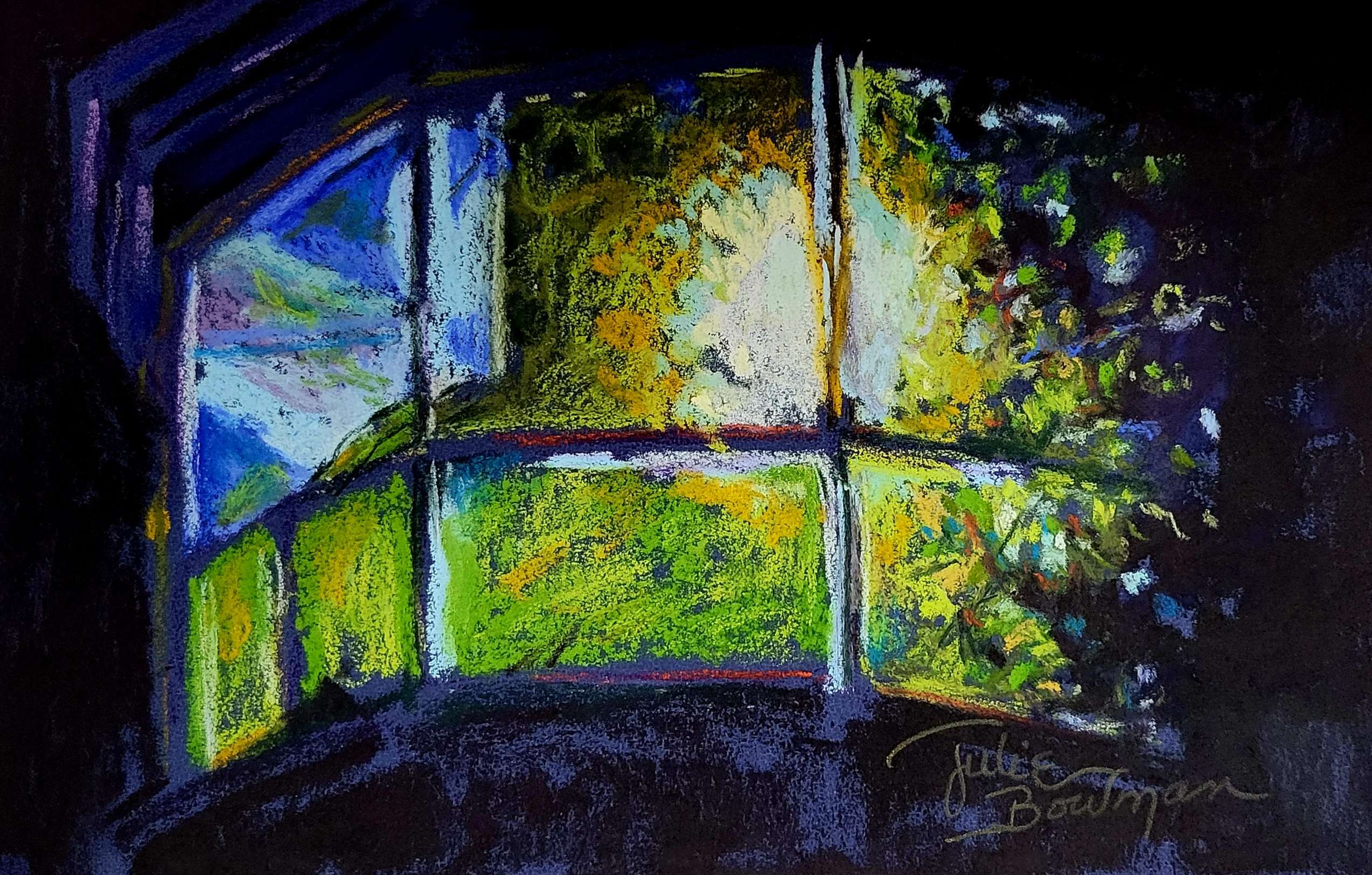 6×10 pastel matted and framed in mahogany-colored frame, 10×15″ ready to hang.  Free shipping in continental USA.