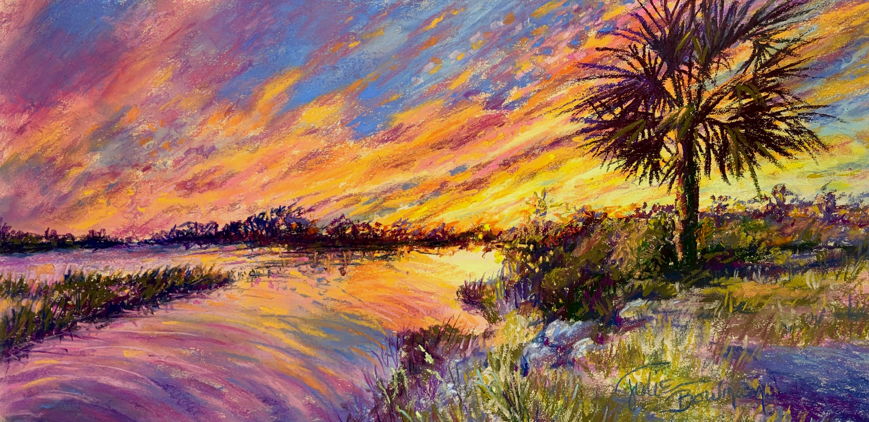 I never tire of painting sunsets and their reflections on the backwaters of the bay. This one is at Levy Bay, Panacea, FL. 13×24, framed. Free shipping in USA.
