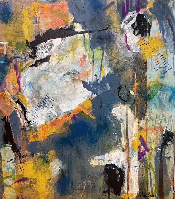 Dusky blues contrast with saffron yellows to suggest an overhead view of a coastline…..graphic white marks reflect a sultry, cloudy morning on the Gulf. Lots of textural marks, add detail and interest to this 20×24 unframed canvas.
