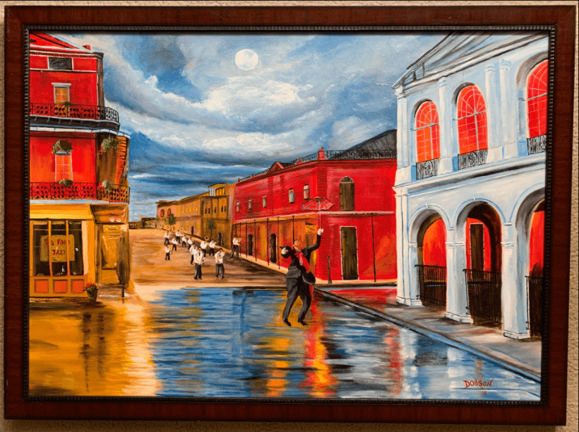 This painting is inspired because of a visit to New Orleans. My paintings hang in hundreds of private collections throughout the US, Canada, the UK, Germany, France, Slovakia, New Zealand, and Switzerland. My intention is to create art that is happy and fun for everyone.