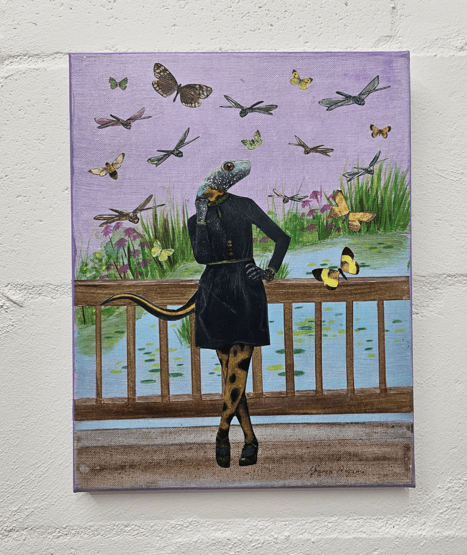 This is an original mixed media piece, created by Gianna Pergamo. It features a fancy newt lady surrounded by dragonflies. The media includes collage and acrylic. The canvas is 11×14,” half an inch deep, and the canvas edges are painted. You can hang it as-is or frame it.