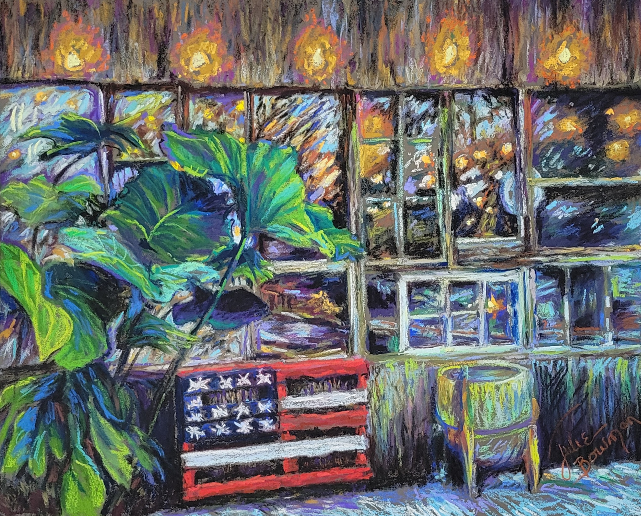 During hurricane Helene evacuation, we headed west to Mobile Bay area with our camper. Bill-E’s is a restaurant that makes it’s own bacon and pork belly. We spent an afternoon there during our “Hurrication”, waiting for it to hit. The whole place is made up of old architectural and kitschy finds. A very fun and relaxing place to visit. I loved the reflections in the old windows, the giant green leaves, and the pallet flag. 16×20 pastel in a brushed pewter colored frame. Free shipping in continental USA.