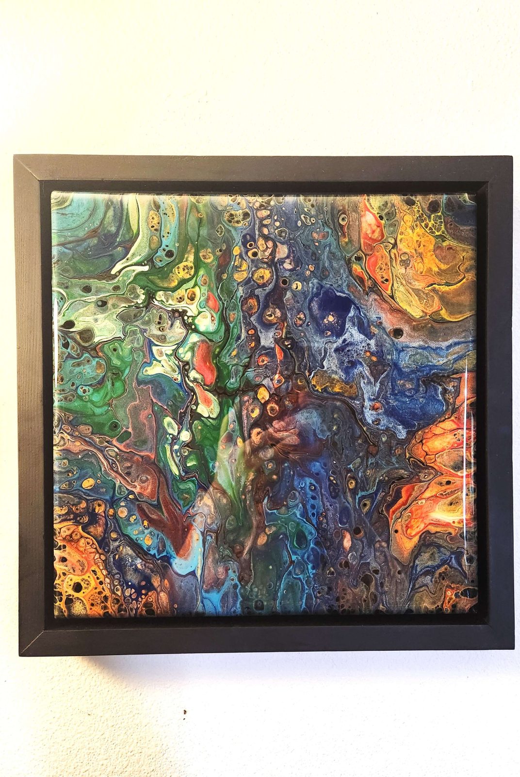 “Ode to Gustav.” Fluid art acrylic pour on 12×12 inch canvas (this piece is 14×16 inches framed). A Paul Wilson original painting.