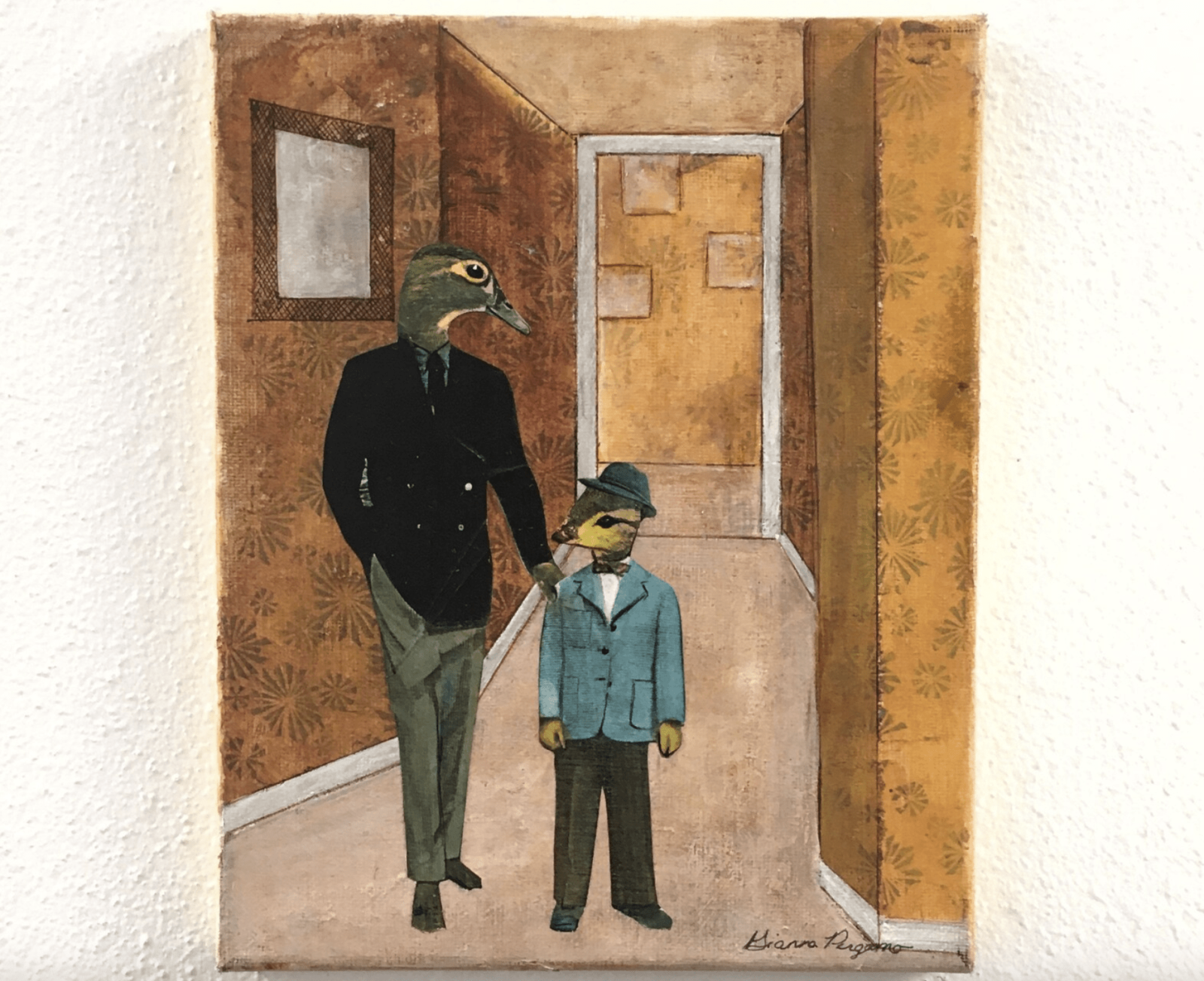 This is an original mixed media piece, created by Gianna Pergamo. It features two male ducks in an office space. The media includes collage, acrylic, and pen on canvas. The canvas is 8×10,” half an inch deep, and the canvas edges are painted. This could hang on your wall as-is, unless you prefer to frame it.