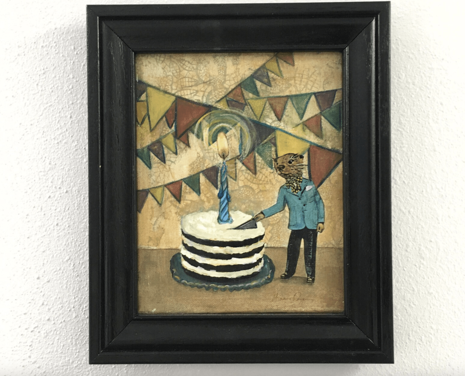 This is an original mixed media piece, created by Gianna Pergamo. It features a dapper otter boy cutting a giant cake! The media includes collage, acrylic, and colored pencil on canvas. The canvas is 8×10,” half an inch deep, and the canvas edges are painted. This piece is framed in a black wood frame. You can hang it as-is, reframe it, or hang it unframed.