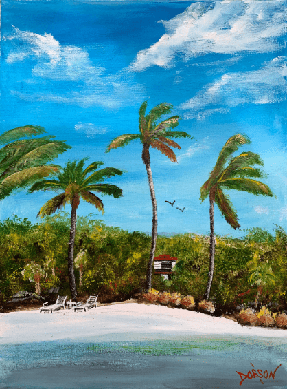 This painting is inspired because where I live in what I describe as paradise aka Siesta Key, Florida. This spot could be somewhere in the Caribbean. My paintings hang in hundreds of private collections throughout the US, Canada, the UK, Germany, France, Slovakia, New Zealand, and Switzerland. My intention is to create art that is happy and fun for everyone.