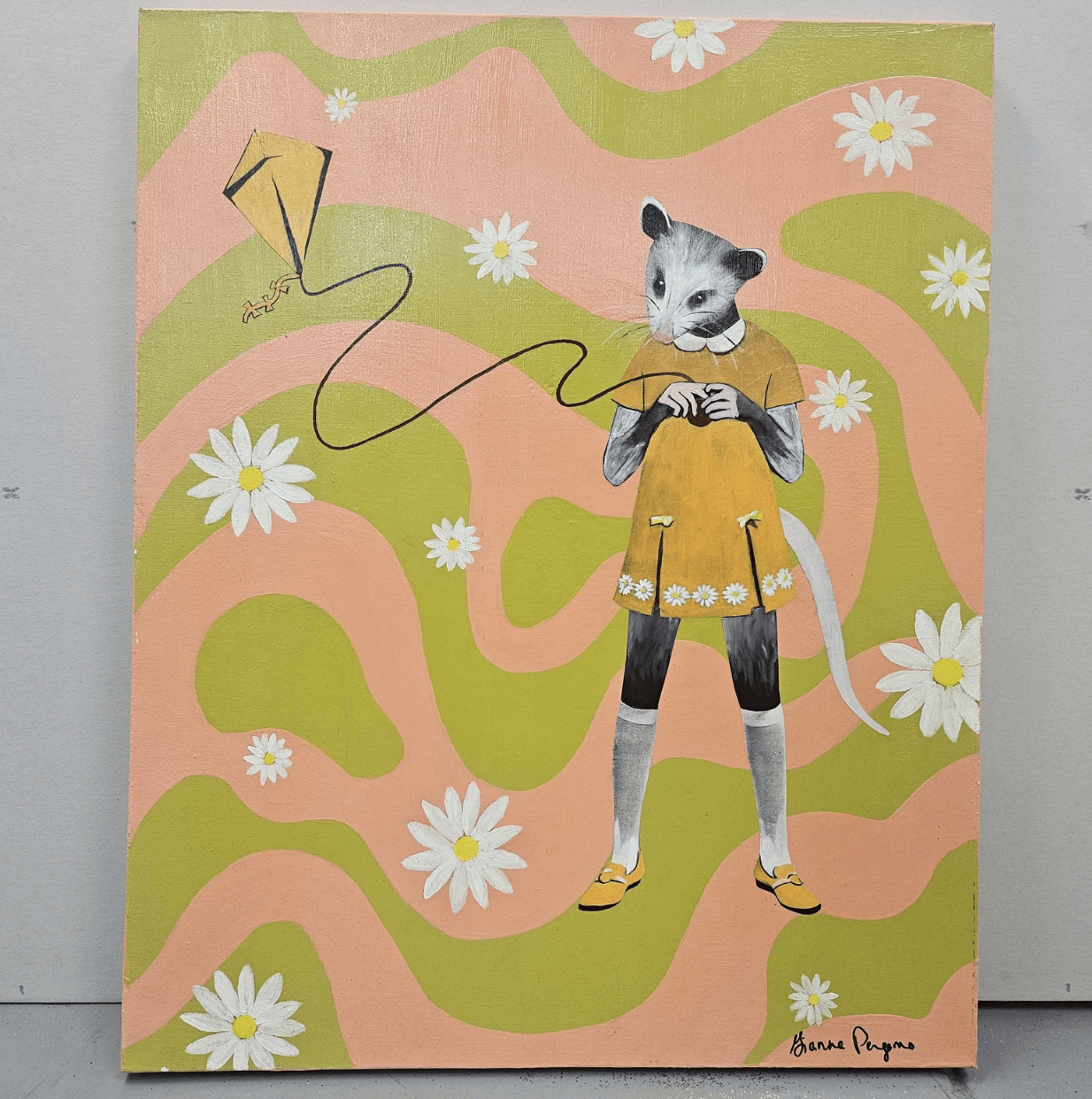 This is an original mixed media piece, created by Gianna Pergamo. It features a cute possum girl flying a kite. The media includes collage and acrylic. The canvas is 24×30” and the canvas edges are painted. You can hang it as-is or frame it.