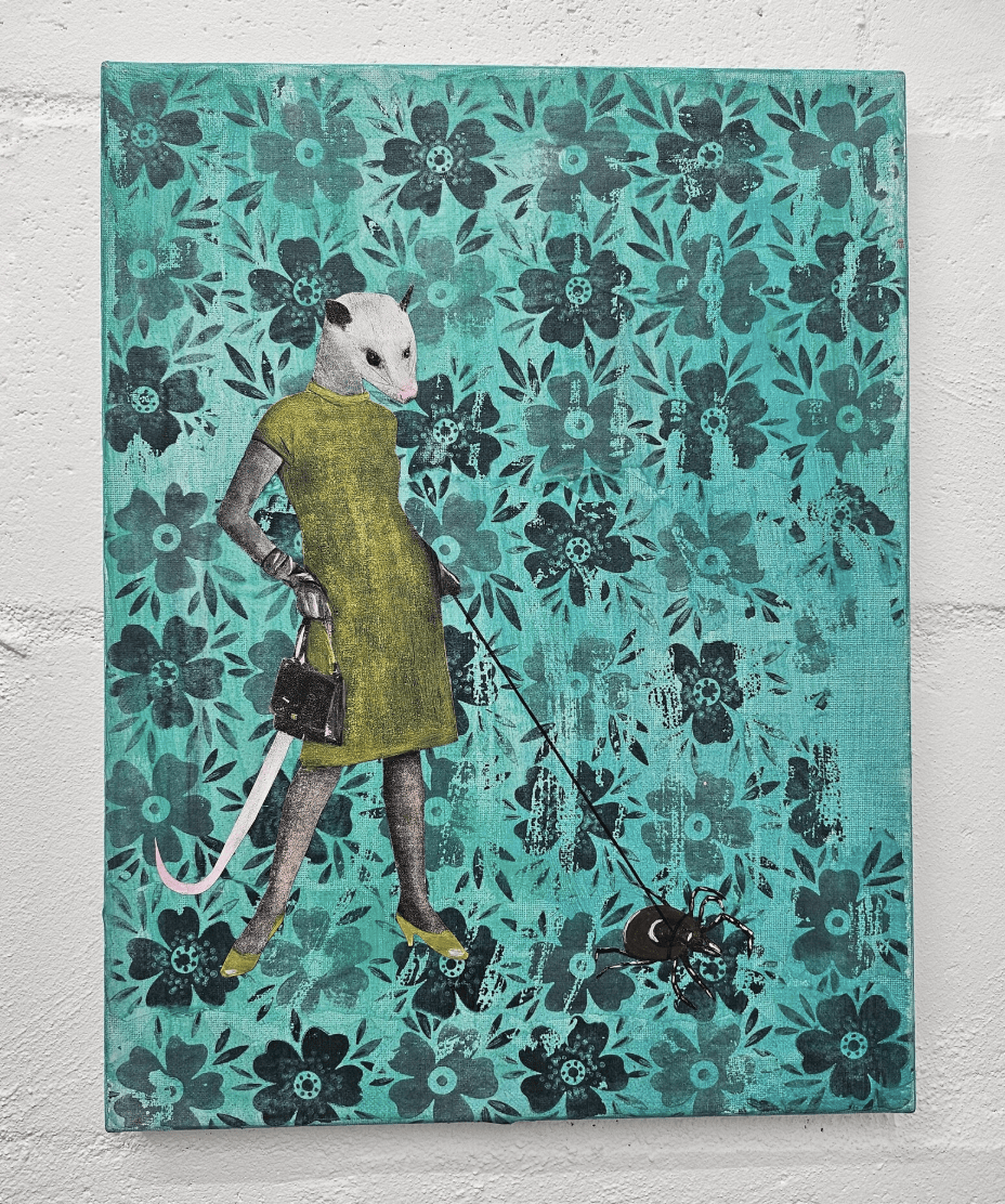 This is an original mixed media piece, created by Gianna Pergamo. It features a fancy possum lady walking her pet tick. The media includes collage and acrylic. The possum lady is collage and the tick is painted. The canvas is 12×16,” half an inch deep, and the canvas edges are painted. You can hang it as-is or frame it.