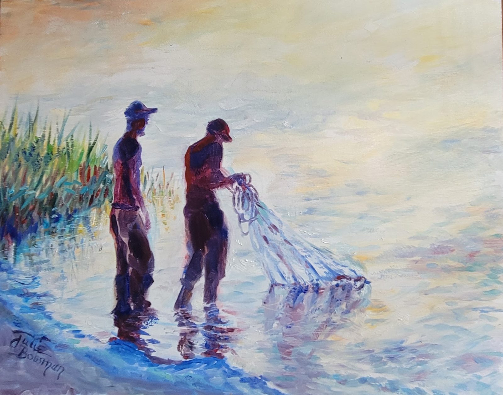 Caught this father and son duo in St. Marks’ Refuge at dawn, getting ready to throw this 16 ft. seine, quite the procedure. Rendered in oil on panel, 16×20, framed in gold. Free shipping in continental USA.