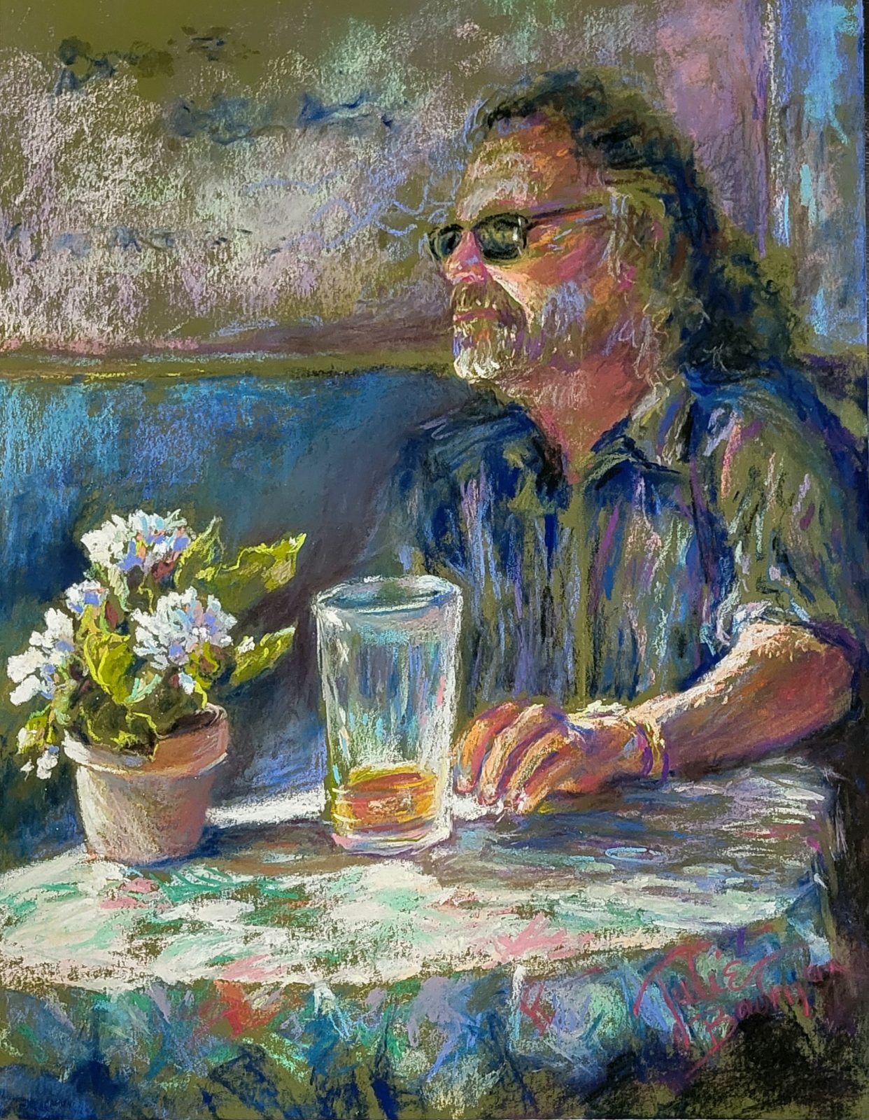 We were visiting Cedar Key a couple years ago, and stopped in at a local pub with a deck on Dock St. overlooking the gulf. This gentleman was sitting nearby in the shade enjoying a pint. I loved how the light danced on the tablecloth and the flowers as her emerged from the shadows. 15×18 pastel, framed in rustic wood. Free shipping in continental USA.