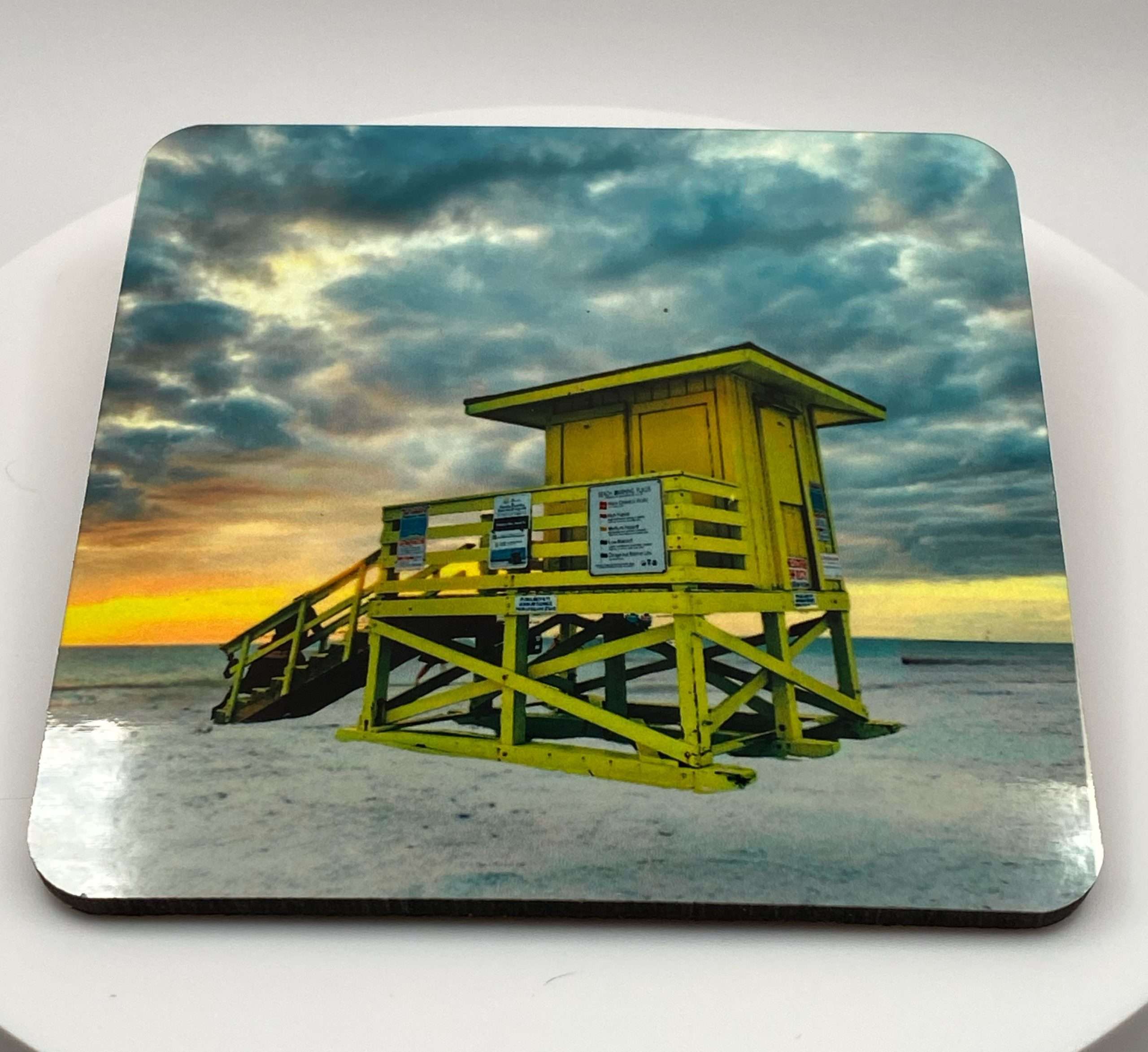 This coaster reminds you every day of beautiful Siesta Key and the lifeguard chairs. Siesta Key Number One Beach, “Siesta Key Magic”; Yellow Lifeguard Stand