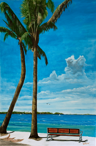 This painting is inspired because where I live in what I describe as paradise aka Siesta Key, Florida. My paintings hang in hundreds of private collections throughout the US, Canada, the UK, Germany, France, Slovakia, New Zealand, and Switzerland. My intention is to create art that is happy and fun for everyone.